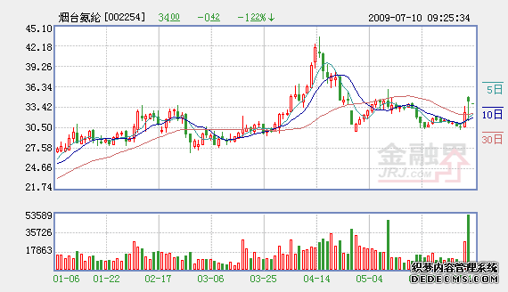 午后,烟台氨纶再次被资金拉升,最高一度达到35元,涨幅超过7%,最终收报34.42元,较停牌前的收盘价上涨5.26%。该股昨天共成交1.77亿元,换手率高达16.42%,是停牌前一个交易日的2倍,创下该股上市以来第三大单日成交记录。