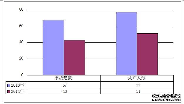 2014年7月,全国共发生房屋市政工程生产安全事故43起、死亡51人,比去年同期事故起数减少24起、死亡人数减少26人,同比分别下降35.82%和33.77%(见图1)。