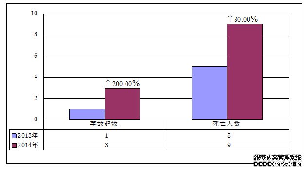 2014年7月,全国共发生房屋市政工程生产安全较大事故3起、死亡9人,比去年同期事故起数增加2起、死亡人数增加4人,同比分别上升200.00%和80.00%(见图4)。