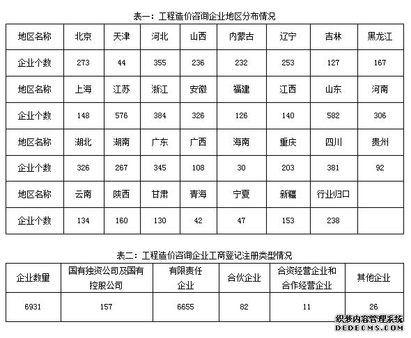 2014年全国共有6931家工程造价咨询企业参加了统计,比上年增长2%。其中,甲级工程造价咨询企业2774家,增长11.6%;乙级工程造价咨询企业4157家,减少3.5%。专营工程造价咨询企业2170家,增长1.8%;兼营工程造价咨询企业4761家,增长2.1%。具体分布见表一、表二: