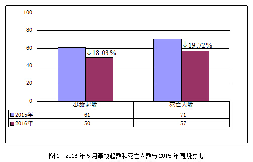 2016年5月,全国共发生房屋市政工程生产安全事故50起、死亡57人,比去年同期事故起数减少11起、死亡人数减少14人,同比分别下降18.03%和19.72%(见图1)。