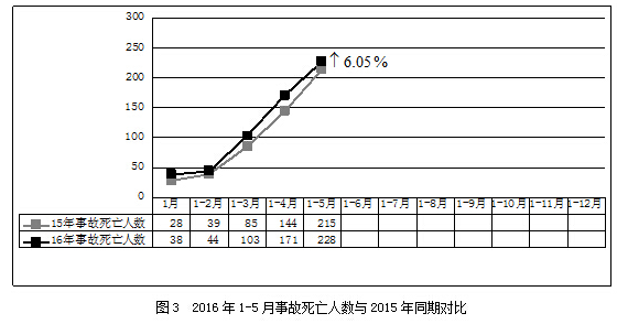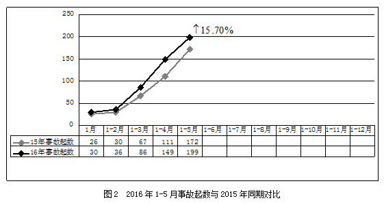 2016年1-5月,全国共发生房屋市政工程生产安全事故199起、死亡228人,比去年同期事故起数增加27起,死亡人数增加13人,同比分别上升15.70%和6.05%(见图2、图3)。