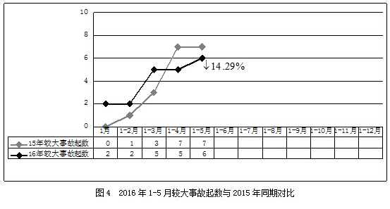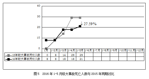 2016年1-5月,全国共发生房屋市政工程生产安全较大事故6起、死亡21人,比去年同期事故起数减少1起、死亡人数减少8人,同比分别下降14.29%和27.59%(见图4、图5)。