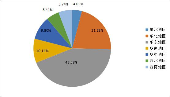 抽样企业中,华东地区(上海、江苏、江西、浙江、福建、山东、安徽)企业数量占比43.58%;华北地区(北京、天津、河北、内蒙古、山西)企业数量占比21.28%;华中地区(湖北、河南、湖南)数量企业占比9.80%;华南地区(广西、广东)企业数量占比10.14%;西南地区(云南、四川、贵州、重庆)数量企业占比5.74%;西北地区(陕西、青海、宁夏、新疆)企业数量占比5.41%;东北地区(辽宁、黑龙江)企业数量占比4.05%。