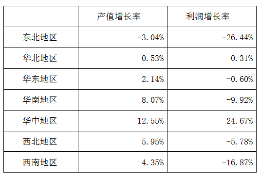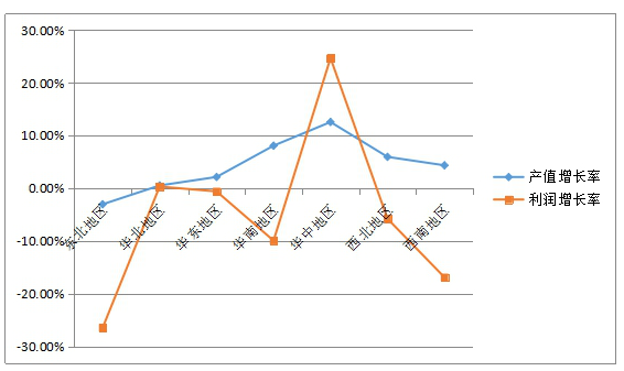 在7个地区内,只有华中地区和华北地区的产值及利润增长率为正向增长,华中地区增幅最大,分别为12.55%,24.67%。其余5个地区的利润增长率相较于产值增长率而言都出现了不同程度的下滑趋势。