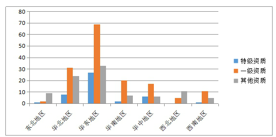 拥有特级及一级资质的企业则大部分分布在华北、华东地区。其中,华东地区的特级、一级资质企业最多,特级企业达到27家,一级企业达到69家,拥有其他资质等级企业数量也达到了33家。而东北、西北地区的特级及一级资质企业数量最少。