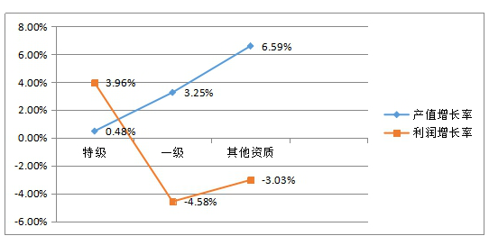 通过计算,得出不同资质企业的产值增长率和利润增长率(图5),可以看出,特级资质企业的产值和利润都呈现出正向增长,虽然产值增长率并不高,仅为0.48%,但利润则同比增长了3.94个百分点。一级资质企业和其他资质企业虽然产值与去年同期相比仍在在增加,尤其其他资质企业,产值同比增长6.59个百分点,是所得利润却大幅度下降。新常态下,不断的扩充产值并没有给企业带来丰厚的利润回报。