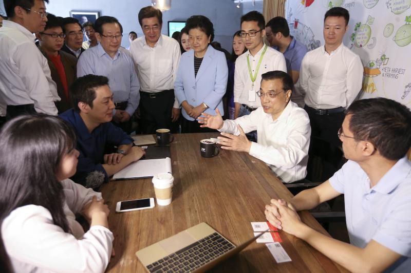 2015年5月7日,李克强来到中关村创业大街3W咖啡。他坐下来与年轻人边喝咖啡边聊创业。蜂拥围拢过来的创业者争抢着向总理介绍各自的项目。听到大家各种奇思妙想的创意,总理感叹道:“这里精彩纷呈,什么想法都有!真正知道社会需求的是大众,这正是大众创业的精髓所在。”(资料图)