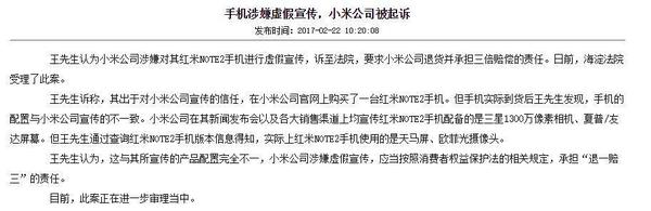 王先生认为小米公司涉嫌对其红米NOTE2手机进行虚假宣传,诉至法院,要求小米公司退货并承担三倍赔偿的责任。日前,海淀法院受理了此案。