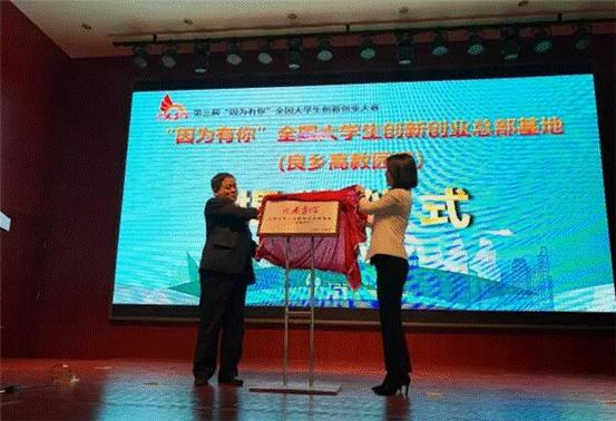 赵琬姝(右)与蔡本睿(左)共同为因为有你全国大学生创新创业总部基地(良乡高教园区)揭牌。