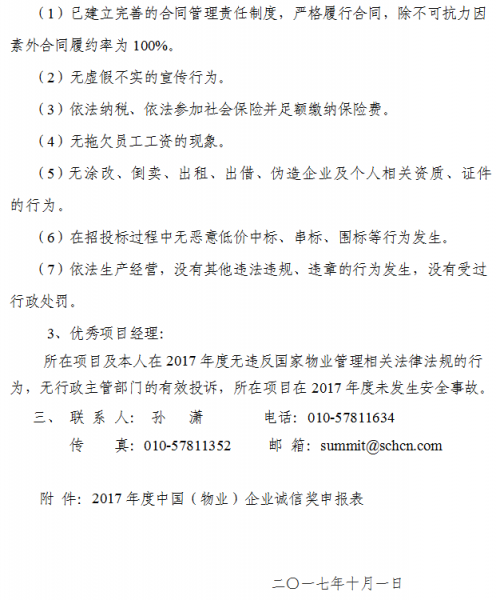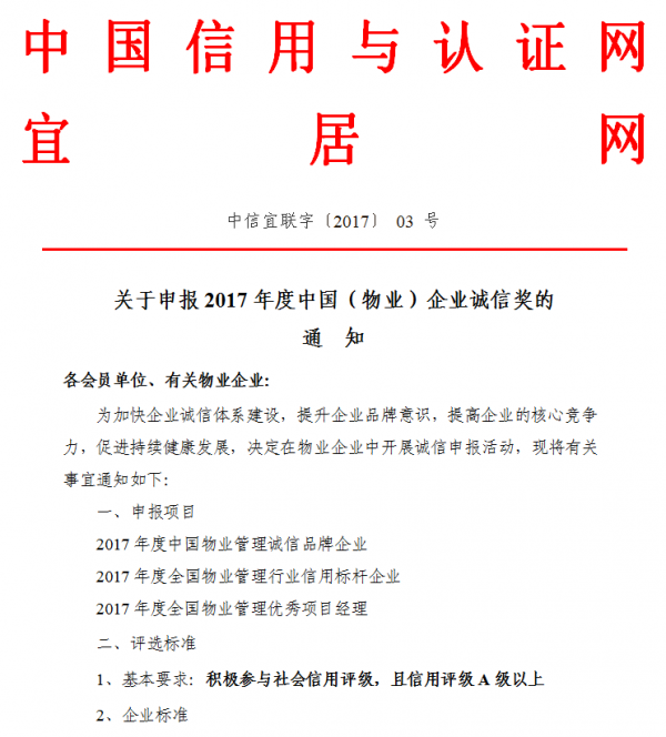 关于申报2017年度中国(物业)企业诚信奖的通知