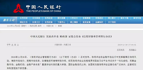 三是健全符合管理实际的监管模式。基于现有监管格局,明确人民银行为信用评级行业主管部门,发展改革委、财政部、证监会为业务管理部门,依法实施具体监管。《办法》作为行业基本监管规则,与分市场、分品种的业务管理规则相补充,既建立了统一监管框架,又体现了各业务管理部门评级监管的相对独立性。