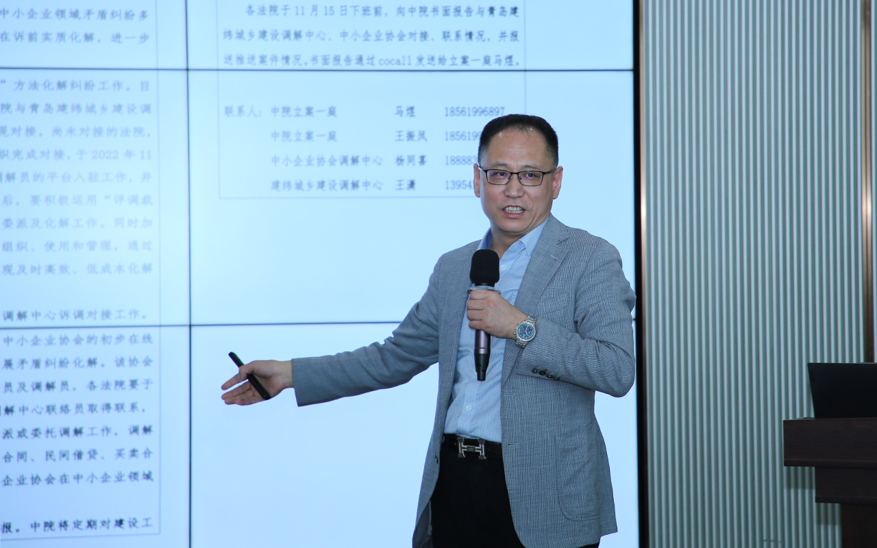 建纬青岛办公室主任王树友讲授《为建设企业营造“避免官司、纠纷可控”的法治营商环境》,他从青岛建纬城乡建设调解中心的工作说起,介绍了调解中心在青岛乃至山东省所作出的各项成绩,指出多元解纷处理现时纠纷的优势,以及争议评审在法院审理案件过程中发挥的重要作用。