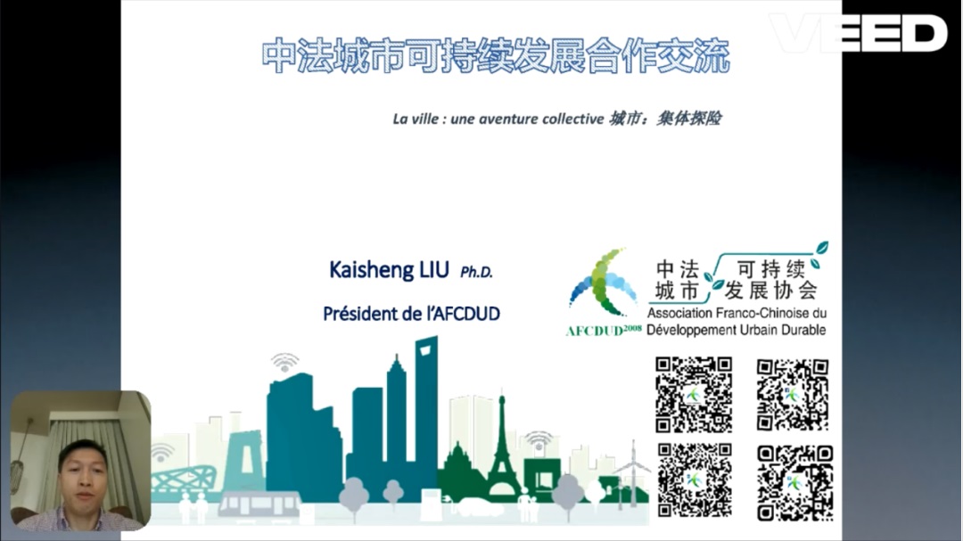 位于法国的中法城市可持续发展协会会长刘凯声发表了以中法可持续城市发展合作交流为主题的演讲,从中法城市可持续发展协会的发展史出发,对中法生态城试点城市、气候变化方面、城市子系统层面和教育与科技方面的合作展开了介绍。