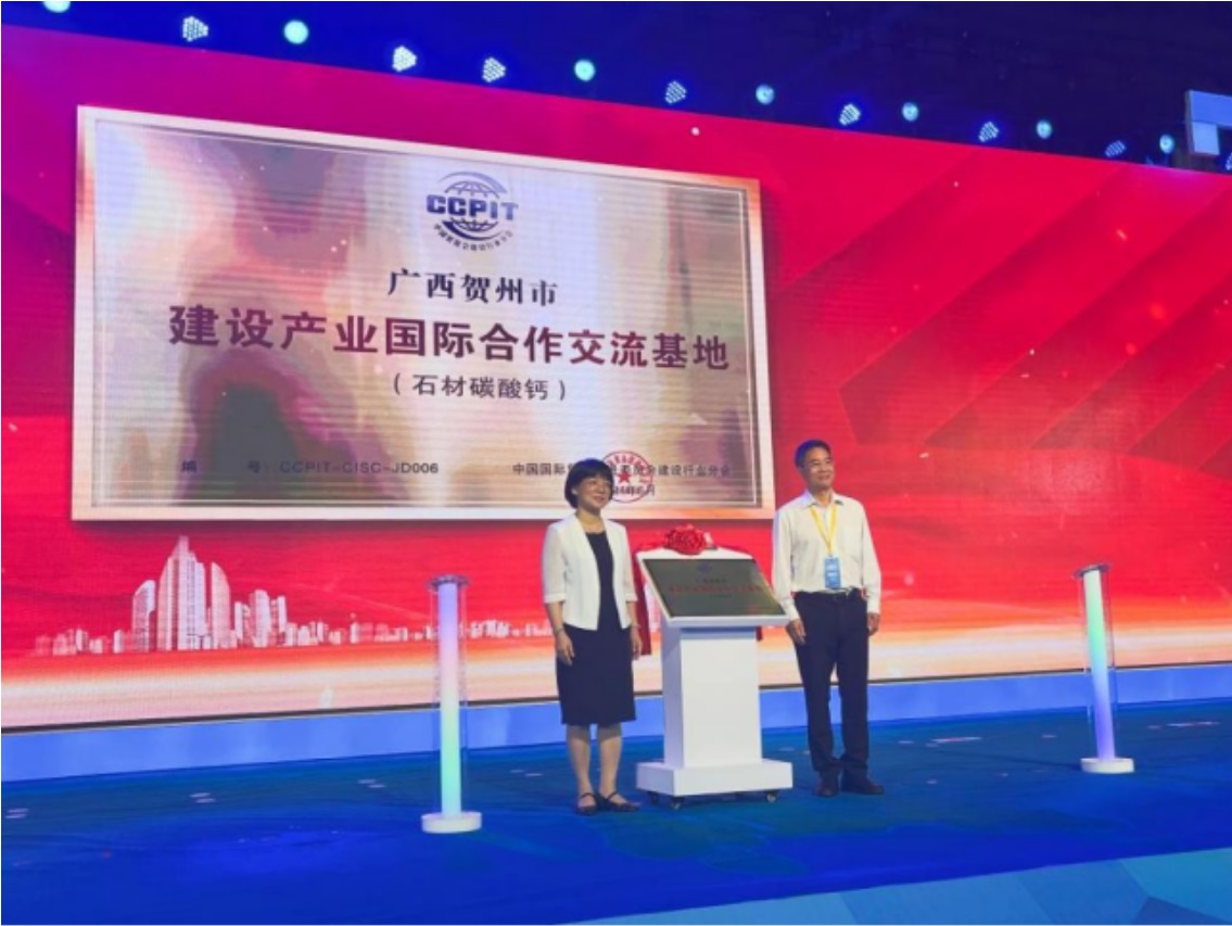 开幕式上还举行了“建设产业国际合作交流基地(石材碳酸钙)”授牌仪式。在音乐声中,李礼平会长与贺州市人民政府副市长罗剑共同上台,为“建设产业国际合作交流基地(石材碳酸钙)”的授牌仪式按下启动按钮,标志着贺州石材碳酸钙产业在国际化道路上迈出了坚实的一步。
