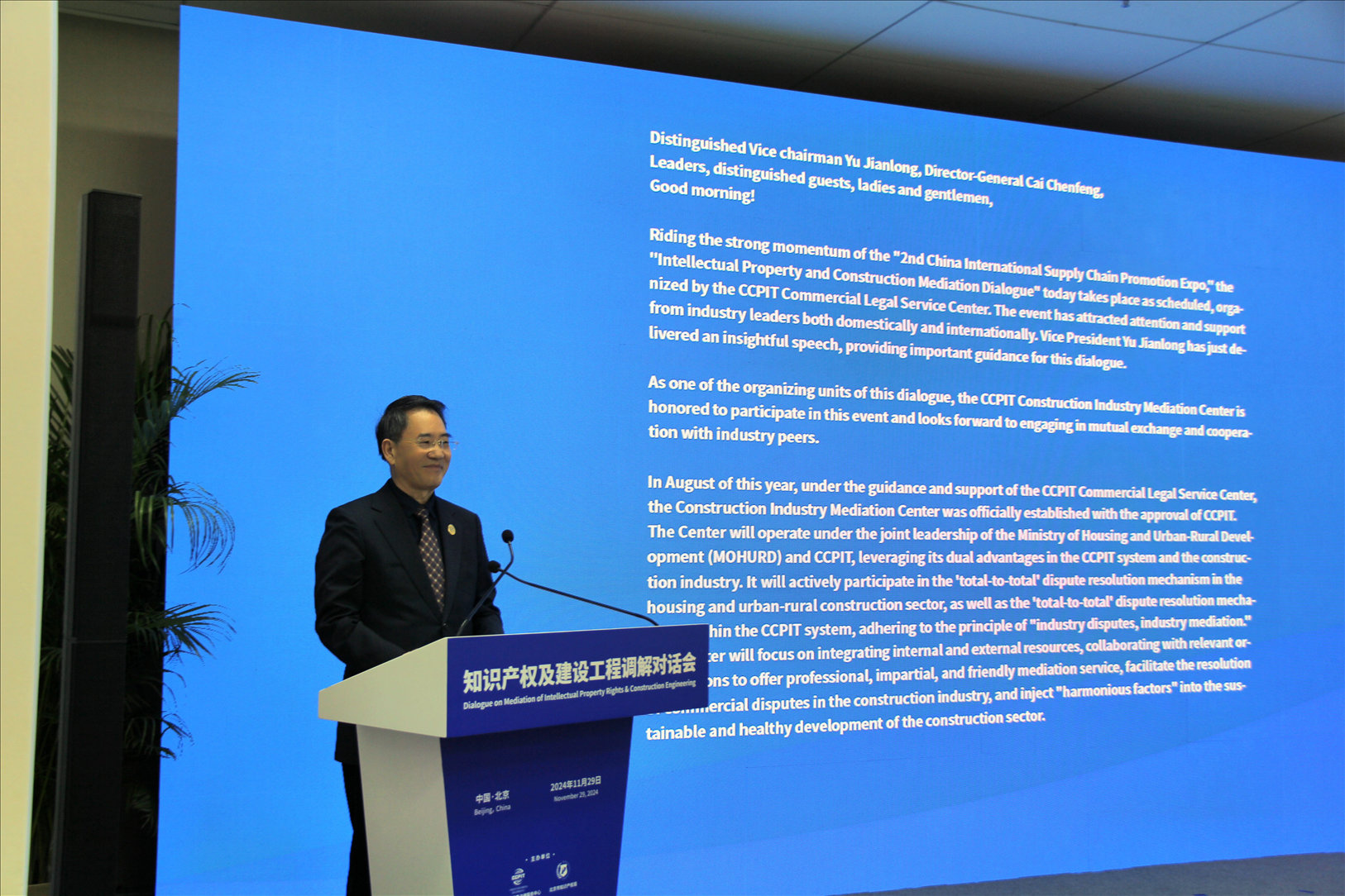 中国贸促会商事法律服务中心主任蔡晨风主持会议,中国贸促会副会长于健龙、马来西亚律师公会主席穆罕穆德·埃兹里·阿卜杜勒·瓦哈卜(Mohamad Ezri Abdul Wahab)、北京市知识产权局党组成员、副局长周立权、中国贸促会建设行业分会会长李礼平分别致辞。