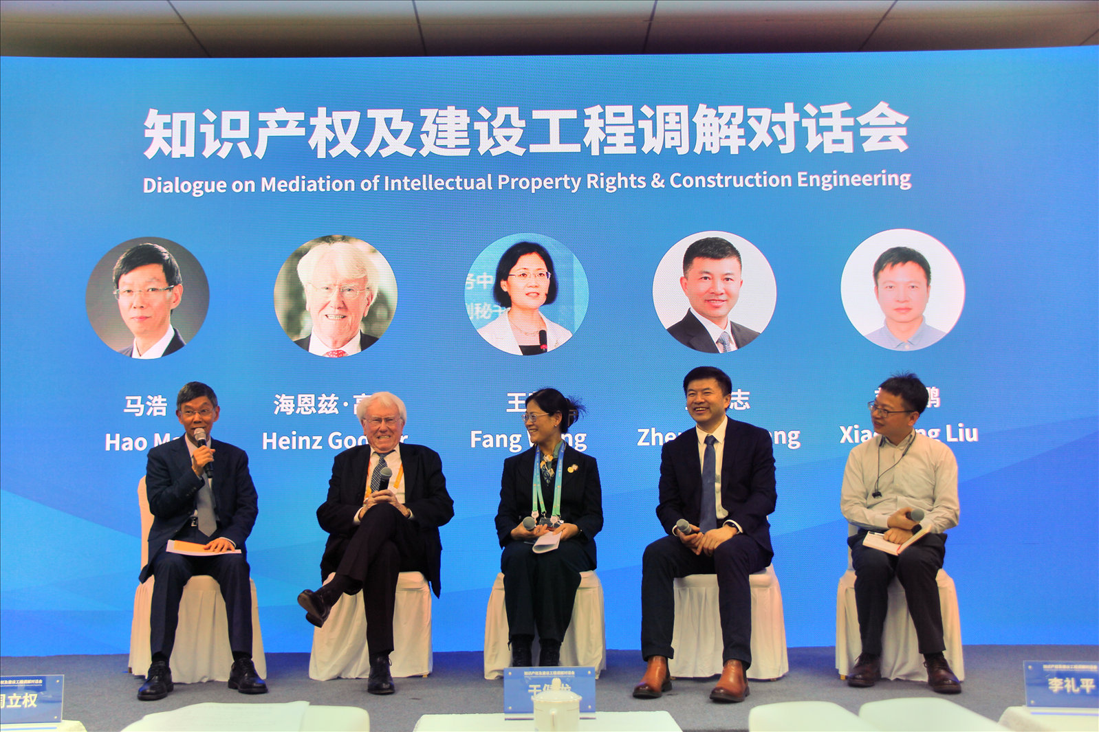 在知识产权对话环节,来自中国贸促会调解中心副主席马浩、德国博默特&博默特律所合伙人、中国贸促会调解中心知识产权专业委员会委员恩兹·高达Heinz Goddar、中国贸促会调解中心副秘书长王芳、高文律师事务所主任王正志、华为知识产权部法务总监刘晓鹏五位专家围绕调解化解知识产权纠纷开展对话交流。